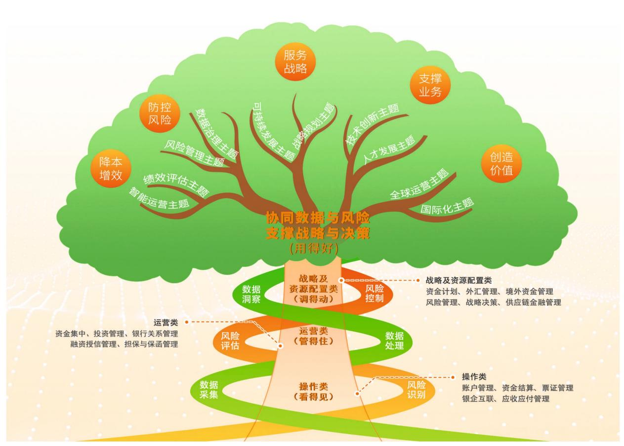 以三类业务为“干”筑牢根基,如同让企业资金管理这棵参天大树稳固扎根;以风险和数据为“链”强化保障,如同为这棵大树的枝干增加保护层,增强其抵御风雨的能力;以五大价值为“果”创造价值,助力集团产业蓬勃发展,推动集团向着建设世界一流企业的宏伟目标奋勇前行。