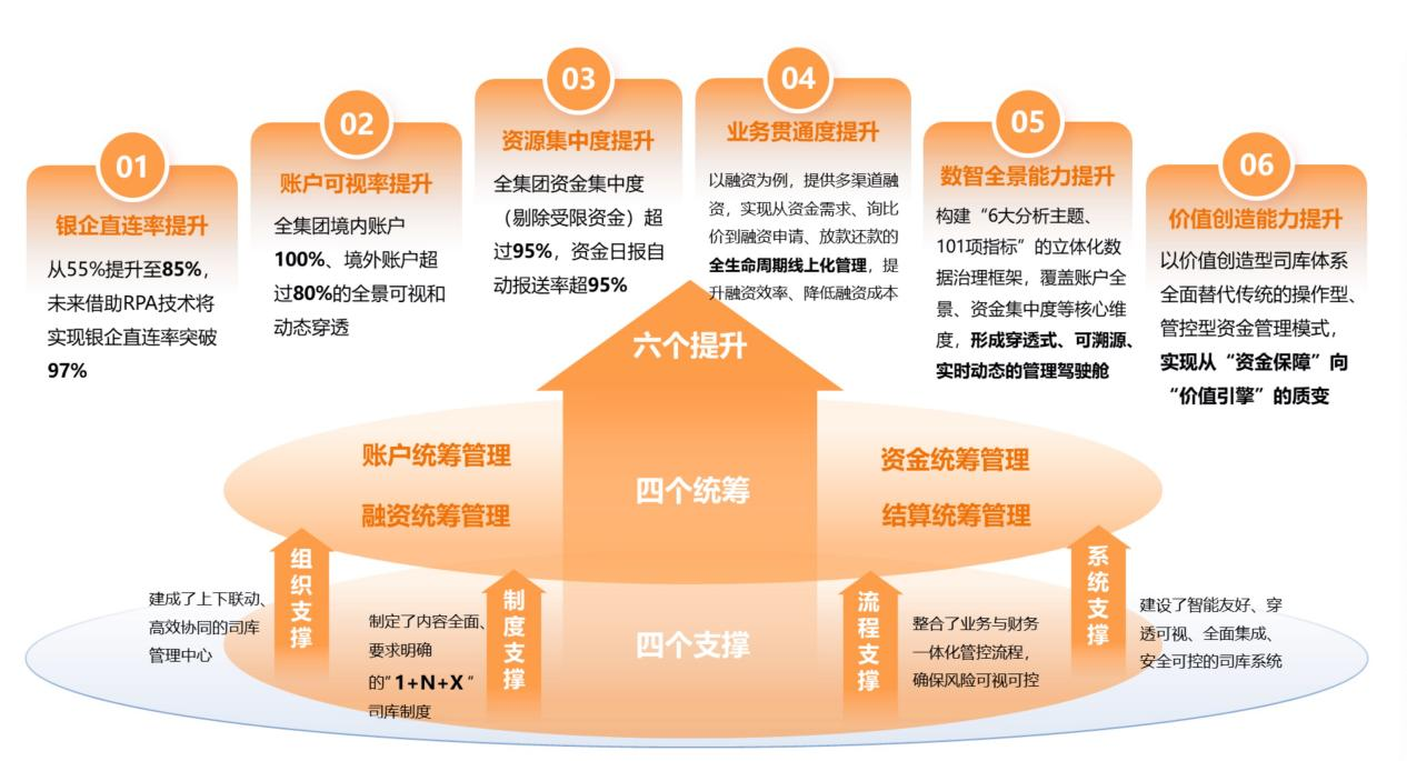 3.实现了“六个提升”。 在银企直连率提升方面,银企直连率从55%提升至85%,未来借助RPA技术,这一比例将突破97%。在账户可视率提升方面,实现了全集团境内外银行账户100%动态可视。在资源集中度提升方面,全集团资金集中度(剔除受限资金)超过95%,显著提升了资金规模化效应和效益,成员企业资金日报从传统的邮件报送升级为系统自动报送,大幅提升了工作效率和数据准确性。在业务贯通度提升方面,以融资业务为例,整合了银行贷款、财务公司借款、平台内部调剂、债券发行等多渠道融资业务,实现了从资金需求、询价比价到融资申请审批、放款还款的全生命周期线上化管理,助力集团提高融资效率、降低融资成本。在数智全景能力提升方面,构建“6大战略分析主题、101项高阶指标”的立体化数据治理框架,覆盖账户全景、资金集中度、融资综合对标等核心维度,形成穿透式、可溯源、实时动态的管理驾驶舱。在价值创造能力提升方面,以价值创造型司库体系全面替代传统的操作型、管控型资金管理模式,实现从“资金保障”向“价值引擎”转变。