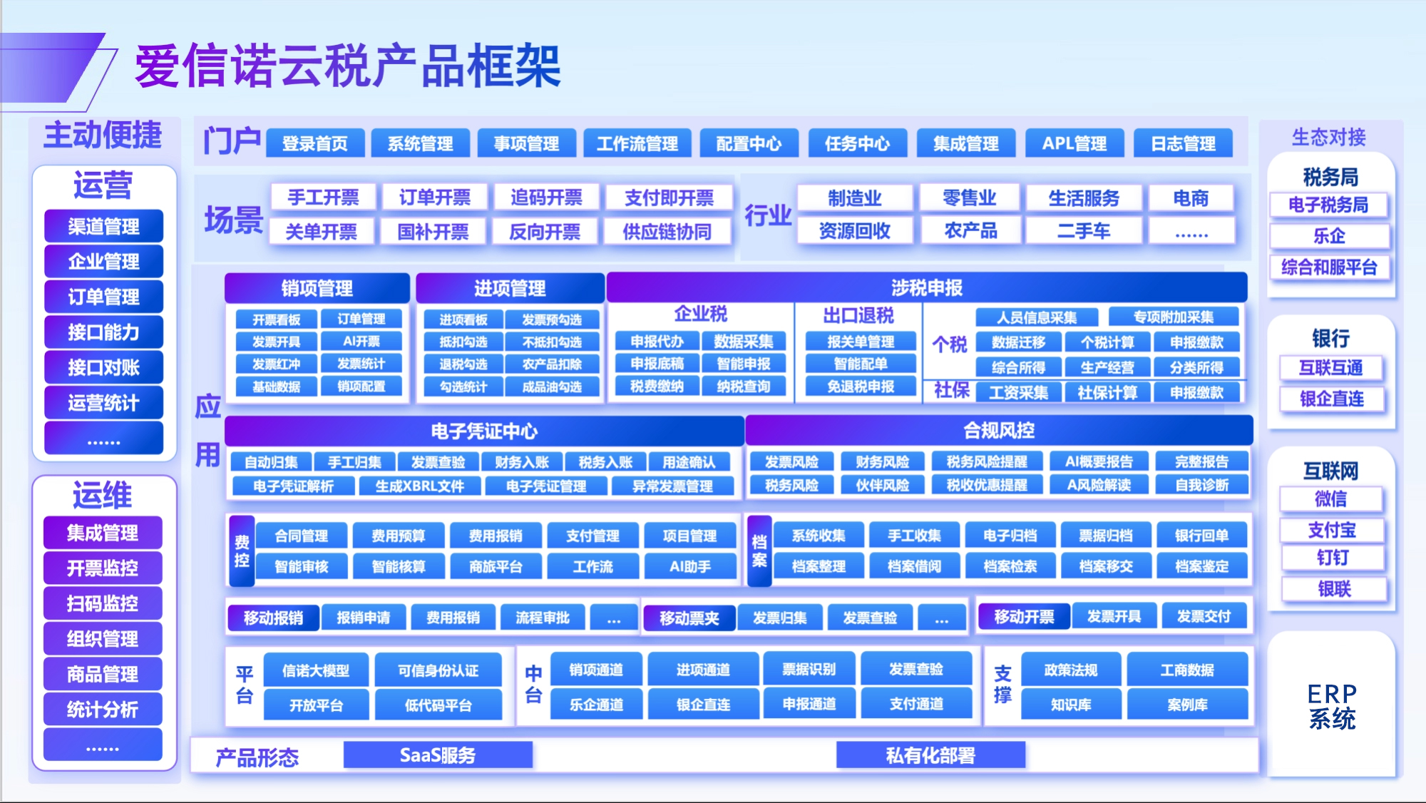爱信诺云税以深化电子凭证应用为中心,构建“三端一平台”产品形态。企业SaaS云端提供全流程数字化服务,移动端满足多角色移动办公需求,运营管理端支撑运营工作,连接服务平台为开发者提供多元服务,全方位覆盖企业财税管理场景。