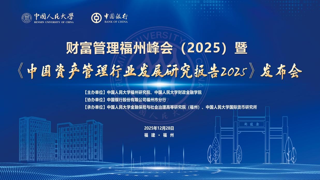 12月28日,“财富管理福州峰会(2025)暨《中国资产管理行业发展研究报告2025》发布会”在中国人民大学福州研究院滴水堂成功举办。本次会议由中国人民大学福州研究院、中国人民大学财政金融学院联合主办,中国银行股份有限公司福州市分行协办,中国人民大学金融保险与社会治理高等研究院(福州)、中国人民大学国际货币研究所共同承办。
